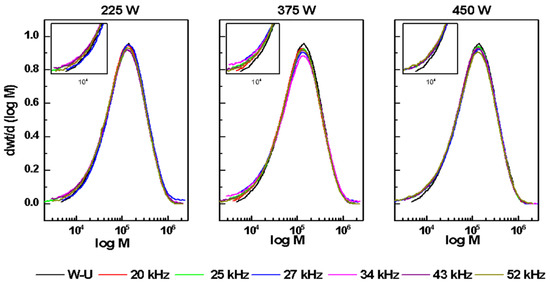 A molecular weight analysis was conducted to understand the effect of ultrasonic waves (frequency and power) on the molecular weight of iPP chains. Figure 4 shows the molecular weight distribution curves for the samples processed with and without ultrasound under different conditions. Detailed molecular weight values are provided in Table 2. The GPC traces shifted to lower values compared to the untreated sample, regardless of the applied power, indicating a reduction in molecular weight as the curves moved toward lower molecular weights. Overall, both Mw and Mn decreased upon ultrasound application. However, the number-average molecular weight (Mn) decreased more significantly than the weight-average molecular weight (Mw). This effect was most pronounced at a frequency of 34 kHz and a power of 375 W. Additionally, a decrease in peak amplitude was observed for the ultrasound-treated samples, indicating that chain scission occurred randomly, favoring the cleavage of high- and medium-molecular-weight chains, increasing the molecular weight distribution, and reducing Mw. This suggests that greater polymer chain scission was induced after ultrasonic treatment, consistent with the literature reports [25,29].