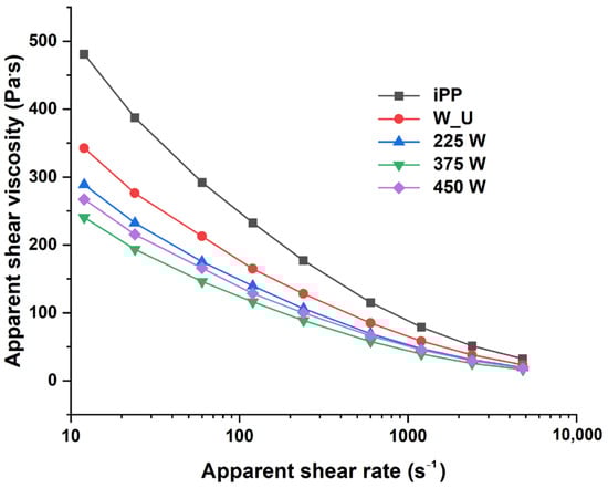 In general, as the apparent shear stress increases, the apparent viscosity of the materials gradually decreases. The highest viscosity value was observed in the pure iPP, followed by the W_U sample, both of which are consistent with values reported in the literature [34]. When ultrasonic waves were applied at 34 kHz, the apparent shear viscosity exhibited a greater reduction than in the W_U sample, particularly at power levels of 225 and 450 W. However, the sample treated at 375 W exhibited the most significant decrease in apparent shear viscosity, attributed to molecular weight reduction and chain scission during processing. This increase in polymer fluidity during extrusion may offer several advantages, including higher production rates, improved extrudate quality, and the formation of a beta phase during polymer crystallization [35].