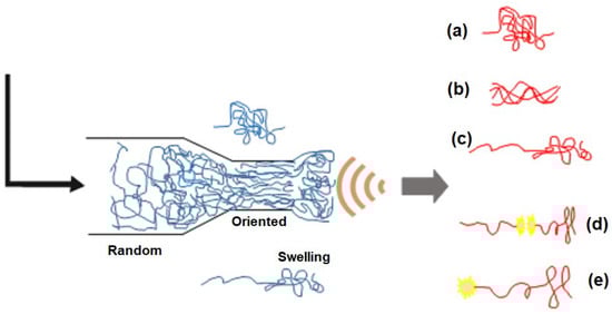 Figure 7 presents a conceptual model illustrating the potential effects of ultrasonically assisted melt extrusion on polymer chains. It is well established that polymers undergo orientation and stress due to extensional flow during the extrusion process, resulting in various conformations of the polymer chain. Upon exiting the die, the chains rapidly interact with ultrasonic waves due to acoustic transmission and radiation forces, which collectively influence the final orientation and structure. Since longer polymer chains have higher relaxation times than shorter chains, greater interchain friction is expected, reducing the number of entanglements (Figure 7a). Other chains undergo stretching and disentanglement (Figure 7b,c), followed by polymer chain scission (Figure 7d,e).