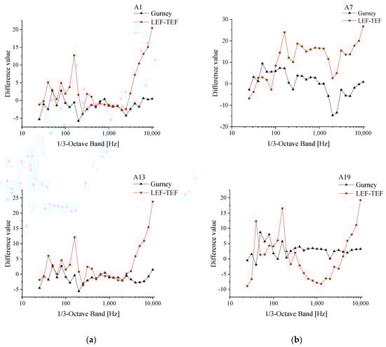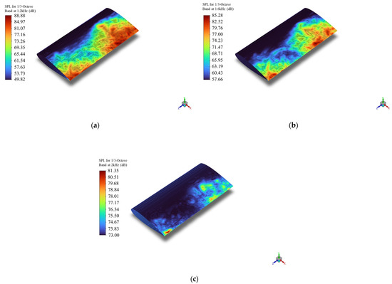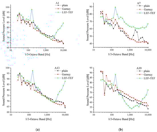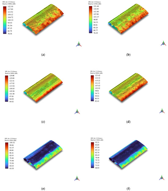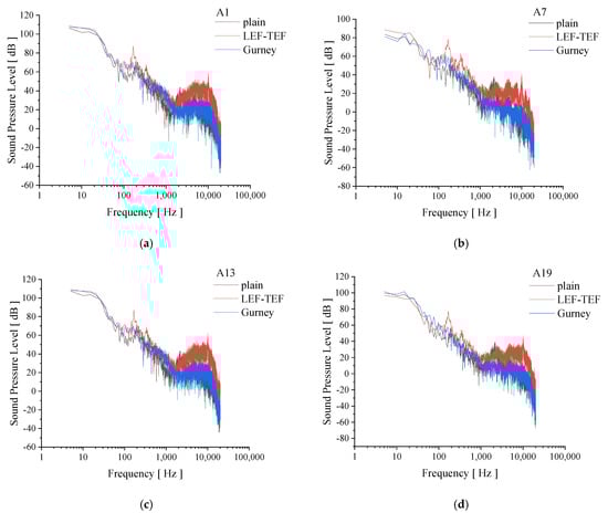 - At an azimuthal angle of 0°, within the low- to mid-frequency range (25–1250 Hz), the Gurney flap airfoil exhibits higher sound pressure levels than the baseline airfoil across most frequencies, with a maximum increase of 9.4 dB observed at 50 Hz. In the mid- to high-frequency range (1250–10,000 Hz), the Gurney flap airfoil shows higher sound pressure only at 10,000 Hz, where it exceeds the baseline by 0.85 dB; at all other frequencies, it exhibits lower sound pressure levels, with a maximum reduction of 14.7 dB at 2000 Hz. This indicates that near the trailing edge, the Gurney flap has a positive effect in suppressing noise in the mid- to high-frequency range. At an azimuthal angle of 180°, within the mid- to high-frequency range (400–3150 Hz), the baseline airfoil displays higher sound pressure levels compared to the airfoil with leading- and trailing-edge flaps, with a maximum increase of 8.19 dB at 1250 Hz. This suggests that near the leading edge, the combined leading- and trailing-edge flaps are effective in suppressing noise within the mid- to high-frequency range.