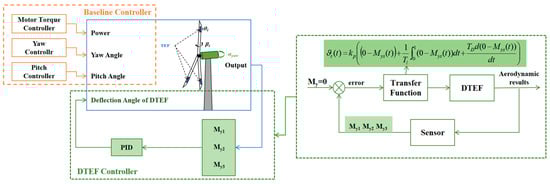 The main control system for the wind turbine used the baseline controller system provided for the NREL 5 MW reference wind turbine. The DTEF control system was completely independent of the main control system of the wind turbine. With a classic PID controller, it reduced the fluctuation in the measured root bending moment (My1) on the turbine blade by adjusting the deflection angle of the DTEF. This control approach was employed to achieve closed-loop control of the blade load.