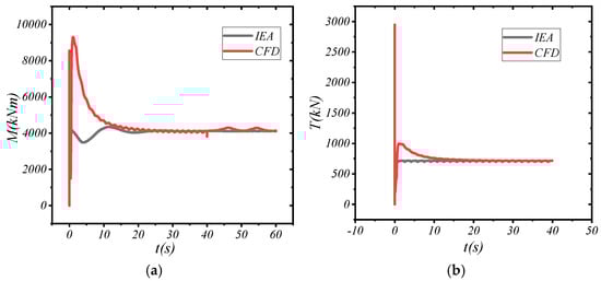 Under the above conditions, model validity verification was conducted by comparing the results with the thrust and torque data provided in the official IEA [15] documentation. As revealed in Figure 4, the simulated thrust and torque were 714.55 kN and 4138.94 kNm, respectively. The deviations from the design data for thrust and torque were 5.71% and 7.43%, respectively, which are within a reasonable error range.