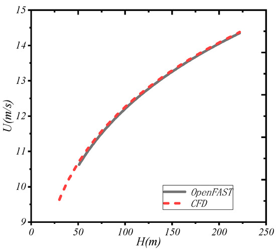 The height above the ground and the wind speed were used as the horizontal axis and the vertical axis, respectively, to verify the accuracy of the inlet boundary condition calculation. During the OpenFAST and CFD simulations, characteristic points on the inlet plane (as shown in Figure 3, the wind is input from the left side and output from the right, so the left side is defined as the inlet plane) were defined, and velocity monitors were set at these points to record the simulation data. The results are illustrated in Figure 5; as we can see, at the hub height (90 m), the incoming flow velocity corresponds to the rated wind speed of 11.4 m/s. According to the wind shear profile, the inflow velocity decreases below 11.4 m/s at altitudes lower than 90 m, while it exceeds 11.4 m/s at positions above 90 m.