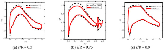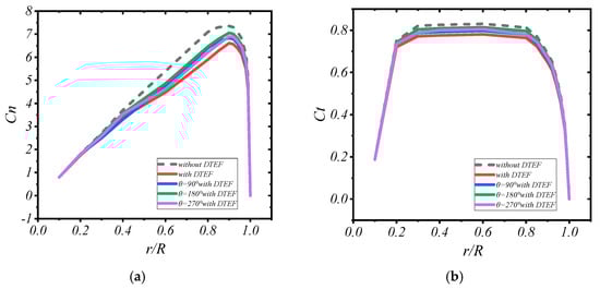 As demonstrated in Figure 9, the deflection of the flap affected the overall aerodynamic characteristics of the blade spanwise, with the most significant impact occurring near the region where the flap was located (0.4 < r/R < 0.9).