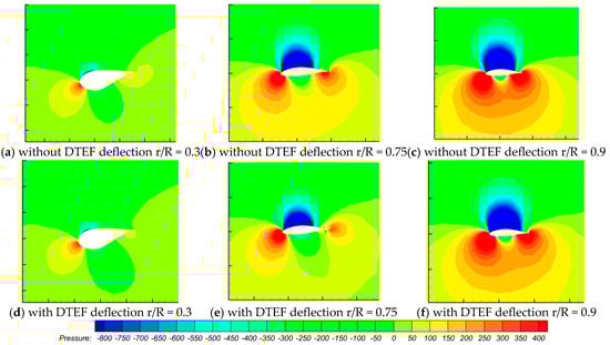 Meanwhile, the pressure coefficient curve of the blade’s cross-section (Figure 10) implies that the deflection of the DTEF lessened not only the pressure difference between the upper and lower surfaces of the airfoil but also the absolute value of the pressure acting on the blade surface. The aeroelastic coupling effect indicates that the force exerted by the air on the blade was reduced, and thus, the aeroelastic interaction between the blade and the surrounding air was weakened, bringing about the further improved aerodynamic performance of the blade during operation.