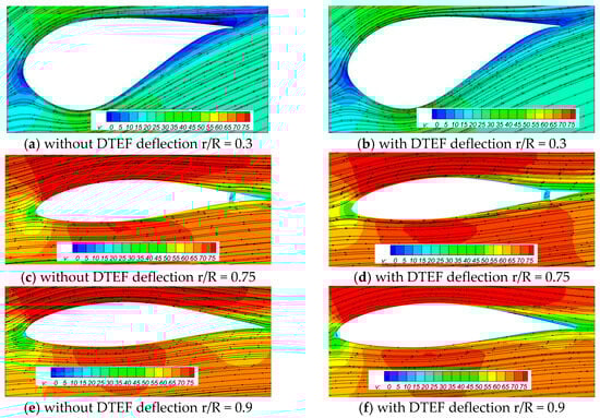 Through a previous analysis of the tangential and normal force coefficients along the spanwise position of the blade, as well as the changes in the flow field around the entire blade surface under the influence of the DTEF, it can be concluded that the deflection of the DTEF affected not only the flow characteristics at the location of the flap but also the flow characteristics at other locations on the blade where no flap as installed. Figure 18 presents the local streamlines in the longitudinal cross-section at the contact point between the flap and the blade.