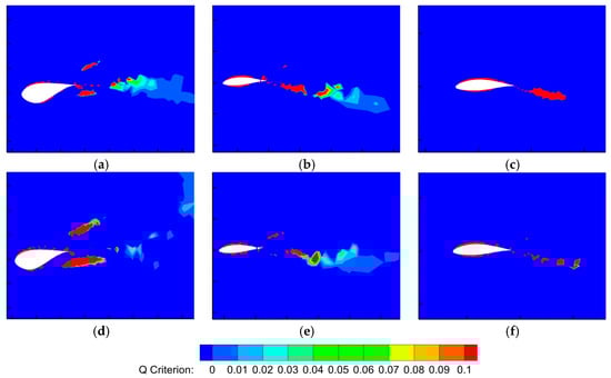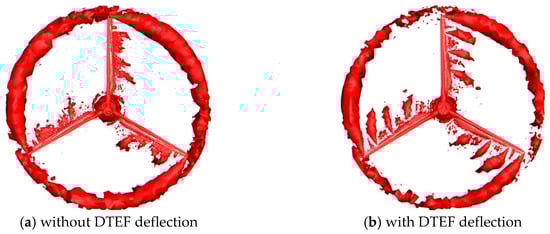 In contrast, the boundary vortex that separates from the blade’s suction surface is relatively weaker, and its formation is closely related to the flow separation on the blade surface. The deflection of the DTEF triggered significant changes in the shape and position of the original boundary vortex. Without flap deflection, flow separation at the trailing edge of the blade typically formed a relatively concentrated shedding vortex structure. However, this concentrated vortex structure was disrupted when the DTEF was deflected, accelerating the dissipation of the vortex structure. Additionally, flap deflection also stimulated the generation of new vortex structures.