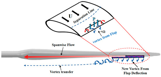 Figure 19 illustrates the mechanism of the altered spanwise flow when the DTEF was implemented. The deflection of the DTEF altered the flow characteristics at the flap’s location, generating a pressure difference between the flap and the blade, as supported by the blade surface pressure distribution in Figure 12. Influenced by this pressure difference, the fluid flowed to both sides of the flap’s spanwise location. This affected the original flow around the blade at the flap’s vicinity and hence the overall aerodynamic characteristics of the entire blade.