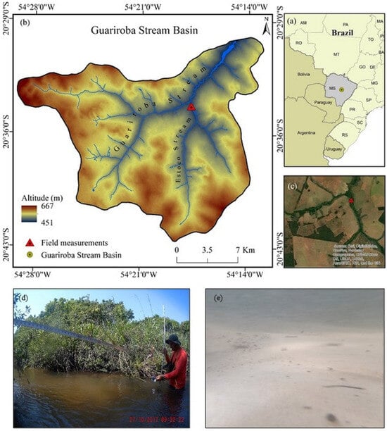 (a) Location of the Guariroba Stream Basin in the central region of Mato Grosso do Sul, Campo Grande City, Brazil; (b) Guariroba Stream Basin and the monitoring point in the Estoco Stream; (c) monitored cross-section of the Estoco Stream; (d) monitoring the cross-section of the Estoco Stream; (e) example of bed-sediment view of the Estoco Stream during high flow.