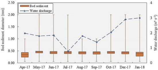 Background of hydrosedimentological monitoring in the Estoco Stream. The left axis shows the bed-material characteristics, and the right axis shows the amplitude of streamflow between April 2017 and January 2018.