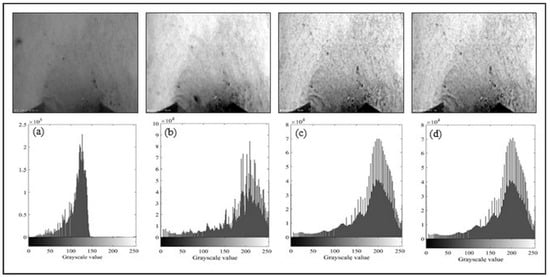 Examples of image pre-processing with algorithms implemented in PIVlab software and its histograms. (a) Original image without any pre-processing. (b) Image with only intensity capping filter. (c) Image with only CLAHE filter. (d) Image with intensity capping and CLAHE filters.