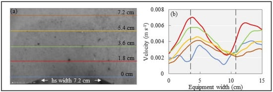 (a) The gray dotted lines represent the projection of the sampler’s edges. (b) Different colored lines represent the velocity magnitude at distances from 0, 1.8, 3.6, 5.4, and 7.2 cm parallel to the entrance of the Helley–Smith sampler.