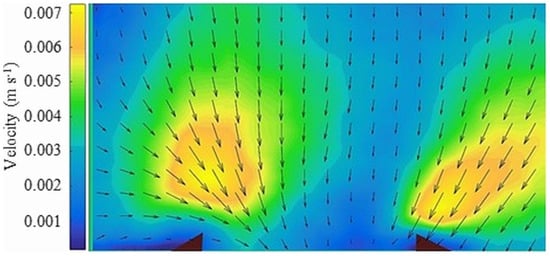 The velocity profiles of the bedload sediments, when approaching the sampler, were susceptible to an acceleration process. The average displacement velocity for a distance of 7.2 cm was equal to 0.0028 m s−1, and, successively, at 5.4 cm it was equal to 0.0034 m s−1, at 3.6 cm to 0.0042 m s−1, at 1.8 cm to 0.0048 m s−1, and at 0 (the sampler entrance) to 0.0026 m s−1. There was an average increase in velocity (upstream to downstream) of 19% every 1.8 cm to the 1.8 cm position. Between 1.8 and 0, there was a decrease of 46%. Through the PIV processing of the images, it can be observed that changes in velocity also influence the direction of sediment flow (Figure 9).