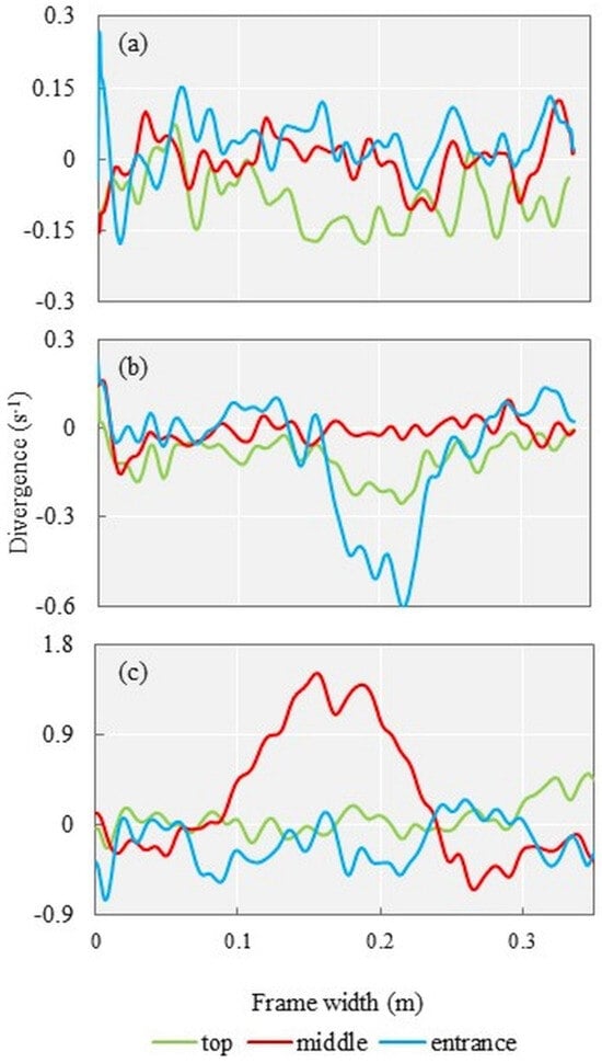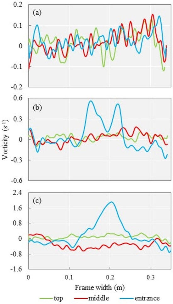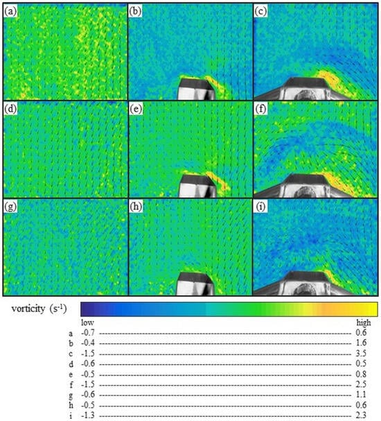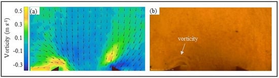 Furthermore, from the images, we can see an intermittent zone with circular movements in the sediment displacement, especially near the edges of the Helley–Smith sampler. From the same number of frames, a vorticity graph was processed (Figure 10).