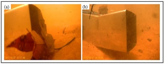 The experiment required using underwater filming equipment to provide us with a better view of sediment displacement near the samplers’ openings. In order to carry out the measurements, some particularities were needed to avoid uncertainties in data processing and to adapt them to the objective of the study. A camera was attached to each structure so that it was perpendicular to the entrance of the Helley–Smith samplers, and a diffuse illumination system for homogeneous images was an important factor to improve the PIV processing (Figure 3). Additionally, a cloth hanging over the cross-section shaded the measurement area to decrease the intensity of solar illumination on the water surface. We divided the experiment into two field measurements, both performed in the same cross-section of the Estoco Stream (Table 2).