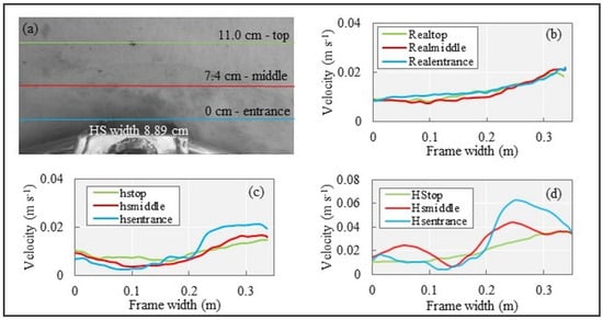 We used the width of the lower edge already known from the Helley–Smith sampler to perform the conversion of frame-per-pixel results to meters per second. Some factors, such as low particle density due to a high-velocity gradient and the identification of particles with displacement outside the analyzed plane, can generate outliers (spurious vectors) [49,62]. For our experimental conditions in the Estoco Stream, we realized that the cross-correlation algorithm identified and processed particles that were moving out of the riverbed plane, causing outliers, requiring post-processing exclusions of these vectors.