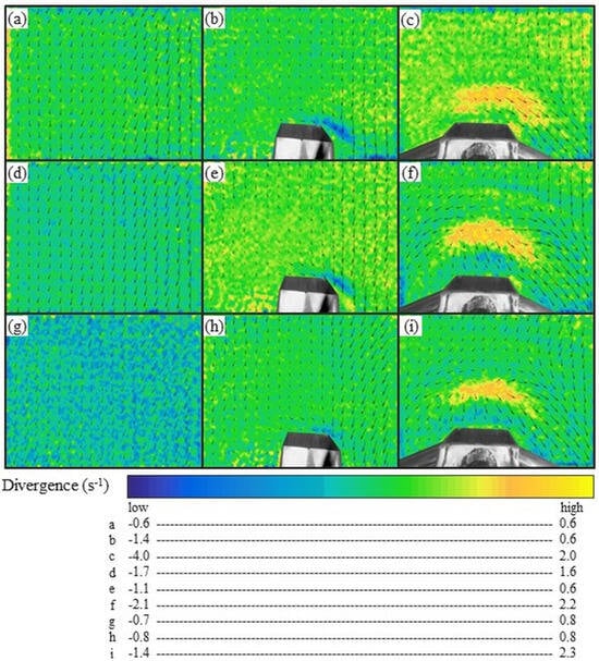 Spatial and temporal behavior of sediment displacement divergence, with and without the insertion of intrusive equipment for bed-sediment sampling. The divergence maps show the same dimensions, 35 × 26.3 cm (x and y axes, respectively): (a–c) after the first minute of processing; (d–f) after the third minute of processing; (g–i) after the fifth minute of processing.