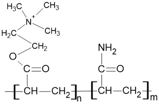High-molar mass cationic polyacrylamide (PAM) FZ-81 from Faisan S.A., León XIII Nº 154, CP 1888 Florencio Varela, Argentina, was used for preparing the polymer solutions. The skeletal structure of the PAM used is shown in Figure 2. As additives, analytical-grade potassium chloride (KCl) and calcium chloride (CaCl2) were used in 0.01 M concentrations. All solutions were prepared with distilled water.