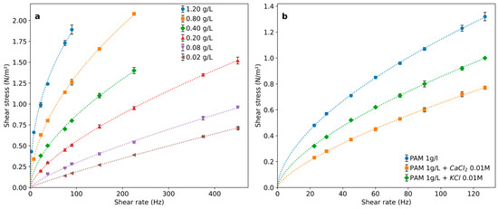 The PAM solutions’ rheological curves can be well represented by Equation (2) with increasing deviations from Newtonian behavior as the PAM concentration increases. Thus, the consistency index increases while the index of flow behavior becomes progressively lower than 1 for higher polymer concentrations (Table 1 and Figure 3a).