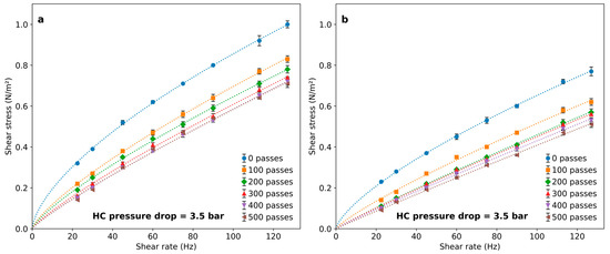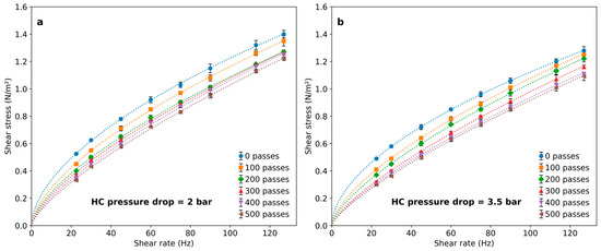Rheological behavior of PAM solutions after a different number of passes through the cavitation device for (a) 2 bar pressure drop and (b) 3.5 bar pressure drop.