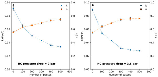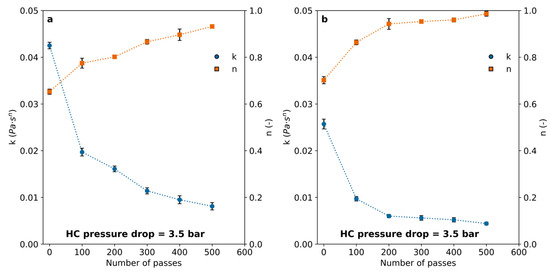 Consistency (k) and flow behavior (n) indexes (Equation (2)) calculated for the PAM solutions after a different number of passes through the cavitation device for (a) 2 bar pressure drop and (b) 3.5 bar pressure drop through the vortex diode.