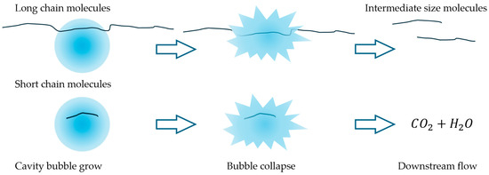 Sketch of the idealized polymer molecules’ evolution under HC. Long-chain molecules can be cleaved to relatively stable intermediate-size molecules by mechanical shear or by partially entering the bubble. Short-chain molecules can enter the bubbles and be further oxidized. As a result, polymer molecules of intermediate size are formed, and further depolymerization by HC cannot be achieved.