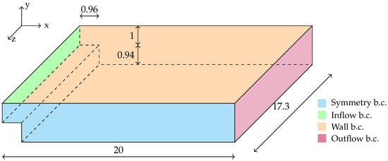 Finite-element simulation parameters for the backward-facing step test case. A symmetry boundary condition with zero normal velocity (no penetration) is applied at the frontal face, while a parabolic horizontal velocity profile is imposed at the inlet. No-slip boundary conditions () are applied at the walls. At the outlet, an outflow condition is imposed by setting the pressure to zero (). The choice of domain dimensions was based on the experiment detailed in [39].