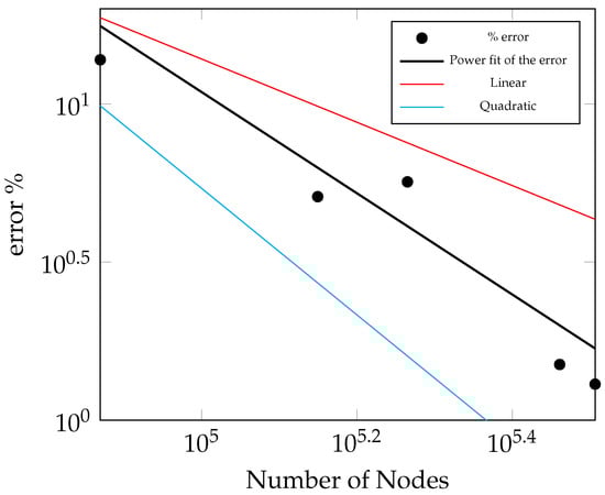 Figure 3 presents a mesh convergence study for the backward-facing step configuration. A power fit of the error using the velocity results from the meshes with 74,000, 141,000, 184,000, 289,000, 321,000 nodes (83,368, 761,304, 1,001,223, 1,606,217, and 1,793,095 elements, respectively) was created in order to compare the order of convergence. It can be seen that the error decreases with an increase in the number of nodes, agreeing with at least linear convergence.