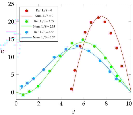 Numerical velocity profile for the backward-facing step test case, compared to experimental data at . In order to compare the data, the numerical results obtained were made dimensional using the reference velocity given in [39]. “L” represents the distance from the step, along the x axis of the domain, and “S” represents the step height.