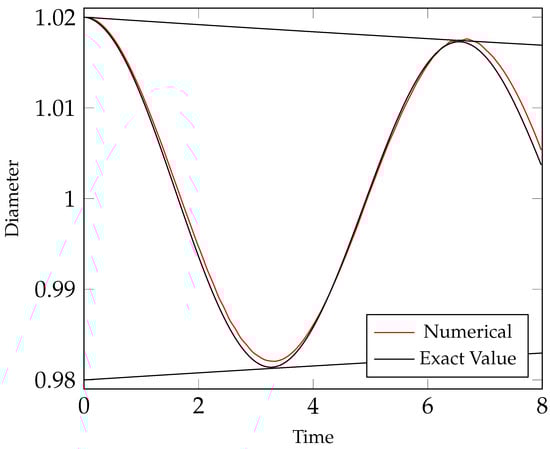 Oscillating droplet results, compared to exact data. The test was executed with over 266 time steps simulating 8 s total, with the Weber number set to . The fluid mesh has an average length at the most refined region, with 594381 nodes and 511,318 tetrahedra.
