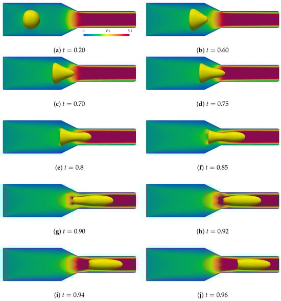 The results of the converging channel simulation can be observed in Figure 7. It initiates with the bubble, gradually adopting a mushroom shape as it advances toward the channel constriction. Upon reaching the constriction, the bubble undergoes a rapid change in shape, which occurs very rapidly compared to other observed phenomena. In just a few time steps, the triangular shape of the bubble transforms; its top takes on a Taylor bubble shape, while the middle undergoes constriction until it passes through the constriction section, assuming the Taylor shape completely.