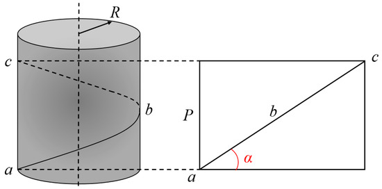 To investigate the influence of stabilizers on local flow disturbance and cuttings transport trajectories, the blade helical angle (α) was selected as a key control variable in the model. The helical angle is defined as the ratio of the helical pitch P to the unwrapped length of the helical path abc, i.e., , as illustrated in Figure 1. Stabilizers with three, four, and five-blade configurations were modeled, with the blades distributed helically along the axial direction to simulate the real-world guiding effect of stabilizers on fluid rotation and cuttings redirection.
