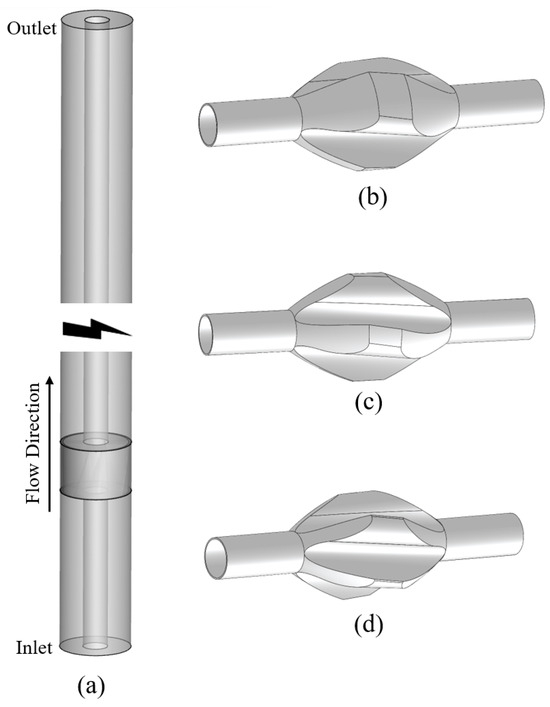 Schematic diagram of the large-diameter wellbore annulus model and stabilizer structure. (a) Large-diameter vertical wellbore annulus model; (b) three-blade stabilizer; (c) four-blade stabilizer; (d) five-blade stabilizer.