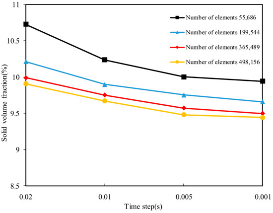 Four sets of mesh–time-step combinations were tested, and the solid volume fractions within the computational domain were systematically compared to evaluate their influence on numerical stability, as illustrated in Figure 3. Under a fixed time step of 0.001 s, the simulation results with a number of elements of 498,156 and 365,489 were compared. The maximum deviation in the cuttings volume fraction during the steady-state stage was found to be less than 0.5%, indicating that the coarser mesh already provided sufficient accuracy and convergence. Considering that further mesh refinement would significantly increase the computational cost, a mesh count of 365,489 and a time step of 0.001 s were ultimately selected for the simulations. Twenty iterations were executed per time step to ensure convergence in unsteady processes and the accurate resolution of particle dynamics.
