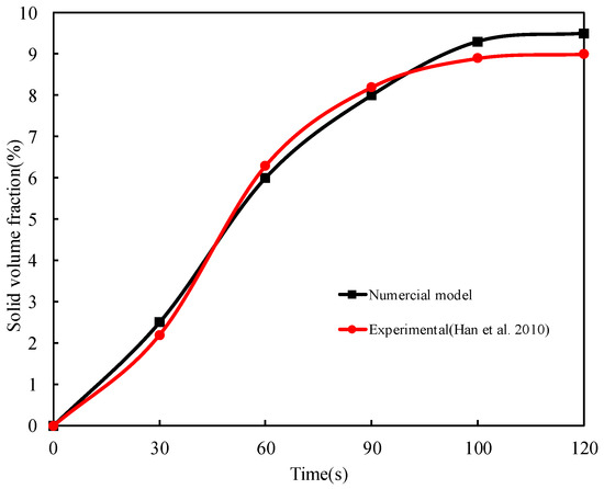 In the referenced experiments, by adjusting the circulation rate, the mass and volume fractions of cuttings discharged at the annulus outlet at different times were measured, yielding the variation pattern of cuttings cleaning efficiency under different flow velocities. Figure 5 presents a comparison between the numerically predicted cuttings volume fraction and the experimentally measured results. The results indicate that the cuttings volume fraction reached a steady state after 100 s, with the simulation results showing good agreement with the experimental data, with an average error of 9.38%. The comparison confirms that the numerical model accurately captures the liquid–solid two-phase flow behavior in the annulus and produces reliable results, validating its feasibility for subsequent simulation analyses.