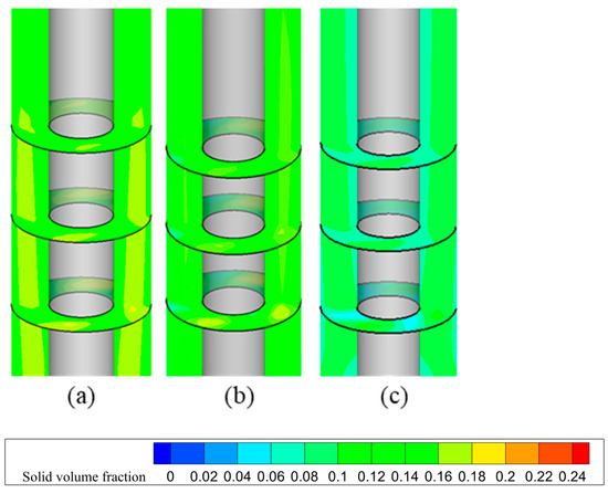 Cuttings distribution in the annulus under different drilling fluid flow velocities. (a) Cuttings distribution at a flow velocity of 0.3 m/s; (b) cuttings distribution at a flow velocity of 0.45 m/s; (c) cuttings distribution at a flow velocity of 0.6 m/s.