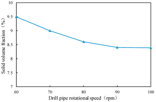 The rotation speed of the drill pipe indirectly affects the cuttings transport process by inducing rotational flow and disturbance within the annulus, as shown in Figure 8. This induced swirl modifies the secondary flow structure in the annular region, leading to more complex flow patterns and enhanced fluid–particle interactions. The simulation results indicate that as the drill pipe rotational speed increases, the solid volume fraction of the cuttings gradually decreases, demonstrating that higher rotational speeds can effectively enhance solid–liquid mixing and promote cuttings suspension. The rotational motion strengthens the circumferential component of the velocity field, which is superimposed onto the axial flow and contributes to increased turbulence intensity and vortex shedding, both of which favor the disruption of settled cuttings.