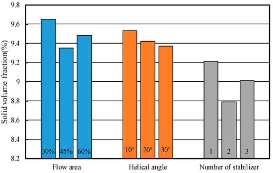As shown in Figure 10, the geometric structure of the stabilizer plays a significant regulatory role in cuttings transport behavior within large-diameter wellbore annuli, primarily by altering the local flow field and the efficiency of cuttings disturbances. The stabilizer, acting as a mechanical flow modifier, directly influences the turbulence generation and the flow reattachment zones around its blades, thereby governing the interaction between the fluid motion and solid particles. This interaction becomes increasingly critical in large-borehole scenarios, where the annular space is wide and prone to cuttings settlement under gravity-dominated flow conditions. The simulation results show that when the stabilizer’s flow area is moderate, it effectively enhances local flow disturbances, thereby generating strong shear layers and resuspension zones that help reduce the local cuttings volume fraction. Conversely, if the flow area is excessively large, the flow-blocking effect of the stabilizer weakens, resulting in an insufficient disturbance intensity, which reduces its ability to lift deposited cuttings and leads to decreased transport efficiency. This diminished shear production limits the upward migration of cuttings, particularly in low-shear boundary zones, increasing the risk of localized deposition and inefficient hole cleaning downstream.
