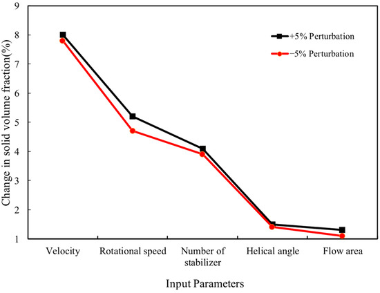 Secondly, a local perturbation test was conducted to validate the consistency of the sensitivity rankings. Each input parameter was independently perturbed by ±5% around its nominal value while holding the others constant. As shown in Figure 13, the resulting changes in the solid volume fraction exhibited a trend consistent with the sensitivity coefficients: parameters with high first-order sensitivity coefficients led to substantial output variations, while those with low coefficients induced negligible changes. This further validates the ranking reliability and the local responsiveness of the model.