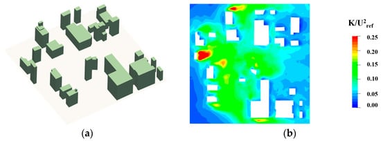 Evaluating urban wind fields using CFD, modified from Zhao et al. [41]. (a) Urban spatial layout. (b) Pedestrian-level turbulent kinetic energy.