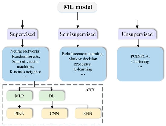 The core principle of ML is to train the proxy model using large-scale original datasets. After the successful completion of the training, the model can achieve excellent computational efficiency and accuracy [56,57]. Notably, this computational advantage provides significant opportunities for accelerating numerical simulation of fluid dynamics, especially for complex flow phenomena that traditionally require resource-intensive CFD methods. ML is classified into three main learning paradigms based on the utilization of the data and the learning objectives, with multiple algorithms for each paradigm, shown in Figure 3.