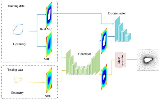 In recent years, neural networks have achieved continuous and significant advancements in the field of finite element mesh generation and optimization [85,86]. Guo et al. [87] proposed a novel approach fusing heuristic and optimization smoothing. The model takes the ring formed by the neighboring nodes of a free node as input, predicts the optimal position of the free node, and optimizes the mesh by moving the node directly without changing the mesh topology. ML-driven techniques for predicting mesh spacing functions [88], such as the Implicit Geometry Neural Network (IGNN), enable the automated generation of adaptive meshes by learning the mapping between geometric characteristics and mesh size functions (Figure 6) [89]. Meanwhile, 3DMeshNet embeds the differential equations for mesh generation into the loss function of the neural network and learns mappings in the space with geometric points as inputs to achieve fast generation of 3D structured meshes. These approaches have exhibited remarkable robustness and efficiency across various scenarios, achieving an 85% reduction in mesh generation time and a 4- to 8-fold decrease in computational costs [90].