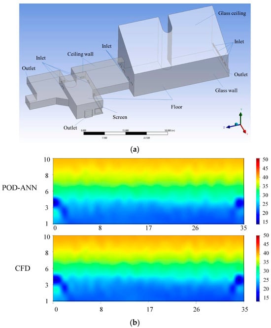 POD-ANN predicts the indoor temperature field, modified from Zhao et al. [25]. (a) 3D model of a real school building. (b) Comparison of POD-ANN and CFD indoor temperature distribution results.