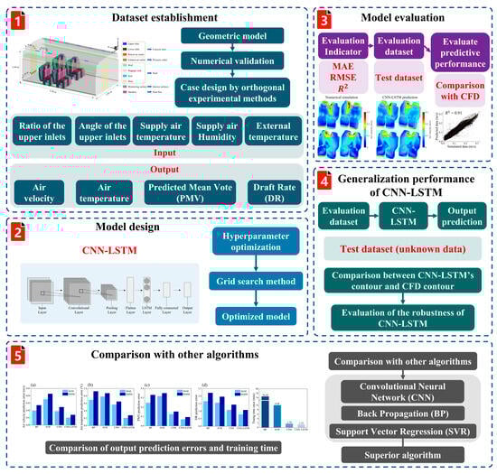Moreover, when facing multivariate boundary conditions or highly dynamic time-series scenarios, the above models still face challenges. To this end, researchers have further introduced hybrid algorithmic architectures to expand the applicability boundaries of the coupled CFD-ML technique by compressing the problem dimensions or fusing the advantages of multiple networks. Wang et al. [123] developed a CNN-LSTM hybrid model integrating CFD data for the first time, which was used to efficiently predict human thermal comfort in indoor crowded environments (Figure 10). The model has high accuracy and stability in predicting dynamic indicators such as air velocity and temperature. The determination coefficient of the test set reaches 0.89, and it has good applicability to scenarios with high requirements for indoor time series data processing. Luo et al. [60] proposed that the POD-RBF model can quickly and accurately predict the indoor air temperature and velocity field, with a short construction and calculation time, with a small error, and is robust to low sampling volume, effectively reducing the burden of computation, suitable for rapid simulation of complex boundary conditions. GA-BP neural network with the help of genetic algorithms to optimize the initial weight of the BP network, the BP network’s prediction of the indicators of insufficient accuracy has been improved.
