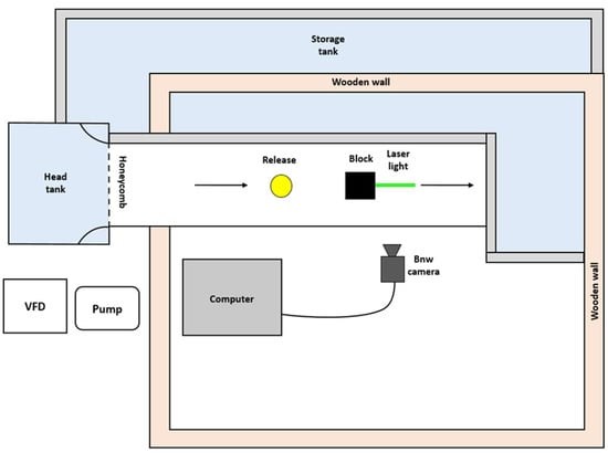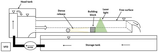 The test setup used for this study is the same as that of the study conducted in [30]. In all the experiments reported in this study, a finite volume of dyed saline water was released upstream of the building block in a free-flowing open channel filled with fresh water. This is shown schematically in Figure 1. Flow visualization was conducted using a laser light sheet on the leeward side of the building, and the results were collected there. Light-induced fluorescence (LIF) and acoustic Doppler velocimetry (ADV) techniques were used to measure the concentration of the dense fluid and velocity of the flow, respectively.