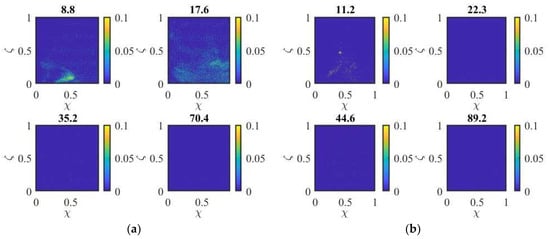 For comparison, the mean and standard deviation of measured at the same location but for continuous release tests [30] are shown in Figure 13. The same qualitative behavior is observed. For small the concentration is small. It then sharply increases with increasing before slowly reducing as gets larger. However, there are two quantitative differences. First, the ensemble average values of for the finite release tests are substantially larger than the mean values for continuous release tests. Second, the largest value of time-averaged occurs at a much lower Richardson number () compared to the finite release tests reported on herein (). The most likely explanation for this is related to the release location. For both the finite and continuous release tests, the dense fluid was released 10 cm upstream of the cube. However, for the continuous release test, the dense fluid was released from ground level, whereas, for the finite release tests, the dense fluid was released from a balloon with a diameter of around 5–6 cm. Therefore, during the initial release after the balloon popped, the dense cloud collapsed down as it was swept forward. There is, therefore, likely to be substantial mixing during this process for low to intermediate Richardson numbers. The peak in the finite release tests is likely controlled in part by the level of mixing in the collapsing stage of the release, with higher leading to less slumping mixing. This would likely result in the peak concentration occurring at higher compared to the continuous release tests that did not have the slumping phase. It is also interesting to note that the variability in the continuous release tests also peaks near the peak in the mean. This is qualitatively similar to the observed variability in the finite release tests.