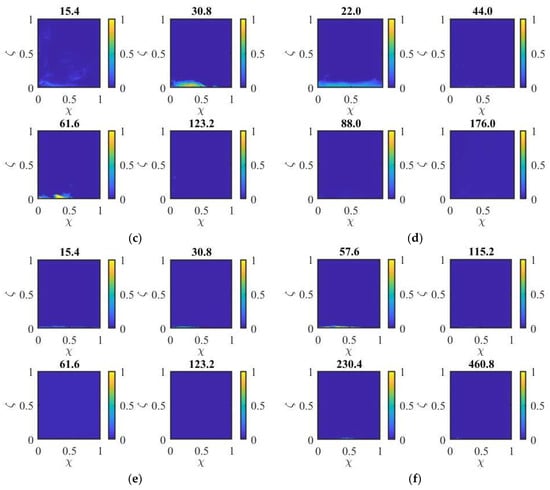For higher ( = 18.3 and 32.6, Figure 5e,f), there is only ever a lower dense layer in the wake, which is consistent with the images in Figure 5 for = 24.5. For the highest Richardson number, the thin layer is still visible at which is the time taken for the fluid to travel 450 times the distance from the release point to the cube.