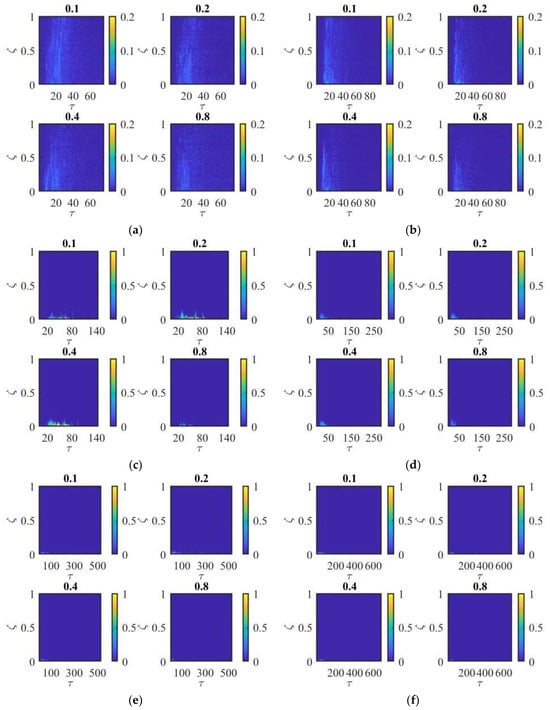 Time series of vertical non-dimensional concentration () at different non-dimensional downstream distances ( listed above each plot) for a range of Ricardson numbers: (a) = 1, (b) = 2, (c) = 4, (d) = 9, (e) = 18.3, and (f) = 32.6.