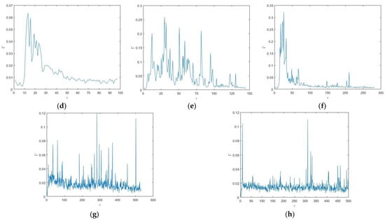Time series of non-dimensional concentration for different Richardson numbers: (a) = 0, (b) = 0.52, (c) = 1, (d) = 2, (e) = 4, (f) = 9, (g) = 18.3, and (h) = 32.6.