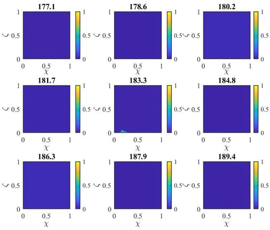 Contours of non-dimensional concentration () at different non-dimensional times ( listed above each plot) for = 18.3.